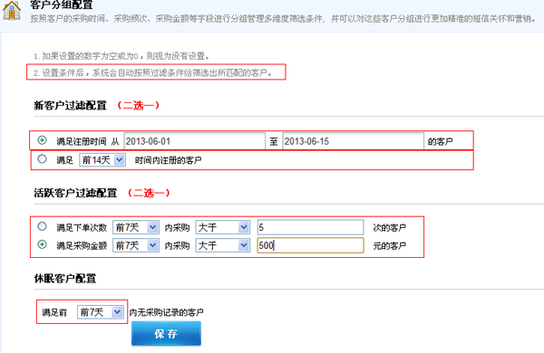 1、按照客户的采购时间、采购频次、采购金额等条件进行分组管理。设置条件后,系统会自动按照过滤条件给筛选出所匹配的客户。