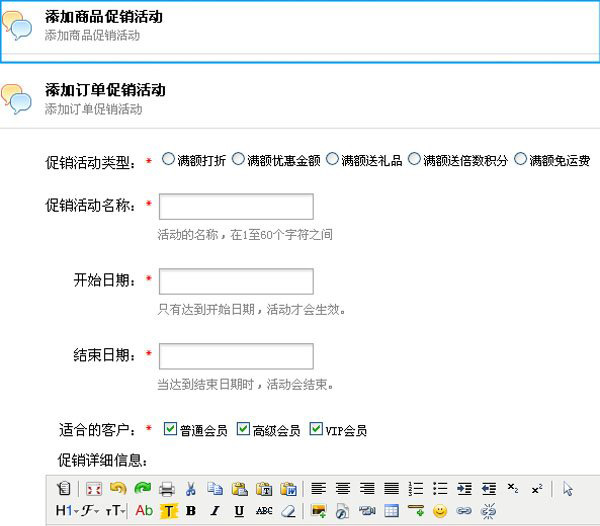 (2)促销活动可以以商品和订单为单位设定不同促销方案