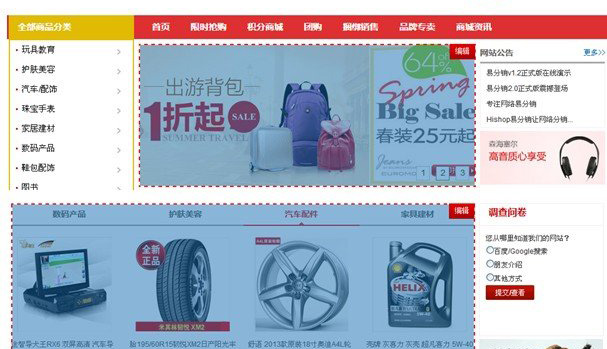 可编辑内容:页头LOGO、图片、首页商品栏目…